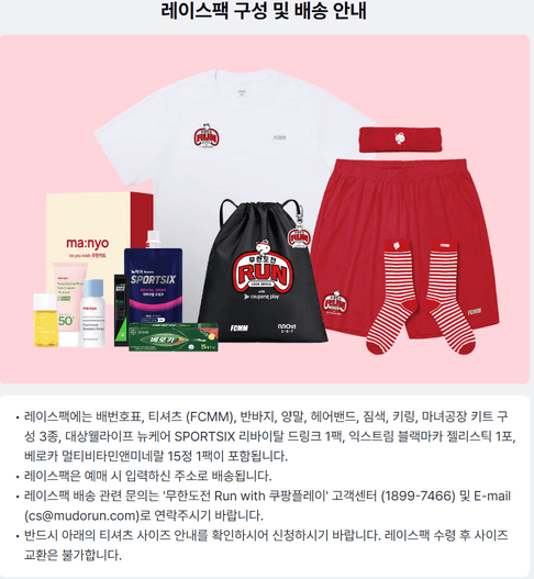 레이스팩 구성은 배번호표, 티셔츠 (FCMM), 반바지, 양말, 헤어밴드, 짐색, 키링, 마녀공장 키트 구성 3종, 대상웰라이프 뉴케어 SPORTSIX 리바이탈 드링크 1팩, 익스트림 블랙마카 젤리스틱 1포, 베로카 멀티비타민앤미네랄15정 이라고 하는데 생각보다 많이 주네요?